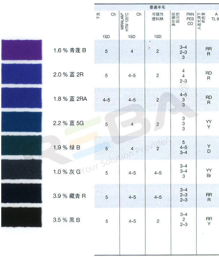 羊毛損傷最小的酸堿值范圍。這一均衡的染色系統(tǒng)由15種產(chǎn)品組成,在多種1。2金屬絡合
