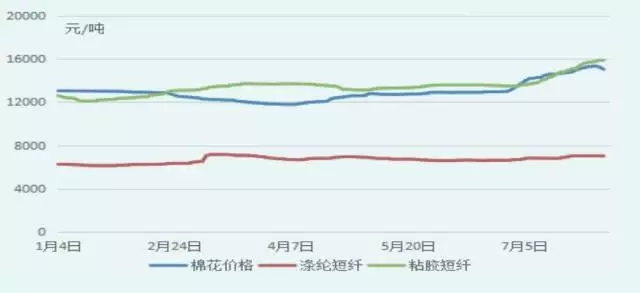 棉花原料價格上漲給下游產品造成一定壓力,然而由于市場需求疲軟,下游織布企業以及服裝家紡行業產需并沒有改變,原料價格上漲并沒有迅速傳導至下游,直至進入7月份才出現松動并緩慢走高。