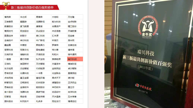 中國(guó)證券報(bào)2015年度中國(guó)新三板“金牛獎(jiǎng)”隆重揭曉,瑞貝科技從5129家新三板掛牌企業(yè)中脫穎而出,榮登“最具創(chuàng)新價(jià)值百?gòu)?qiáng)”榜單。